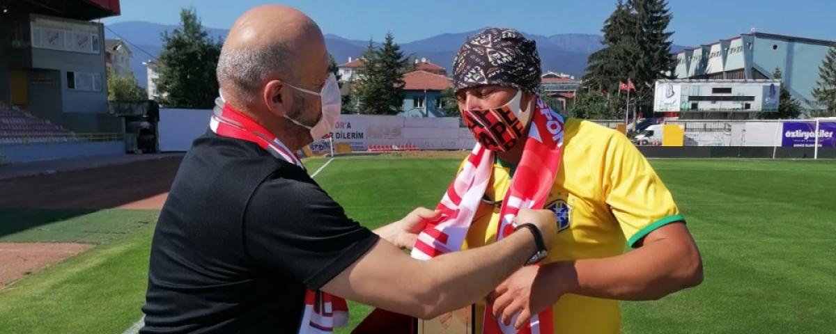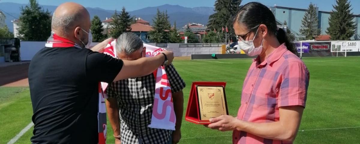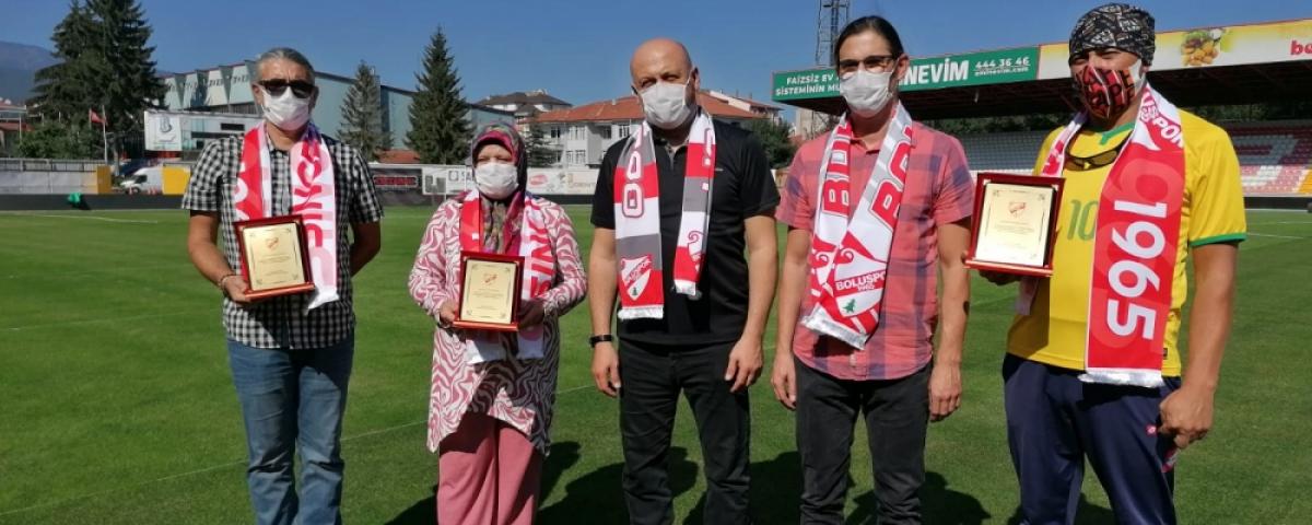 Beypiliç Boluspor Başkanı Abdullah Abat, Boluspor'da geçmiş yıllarda çalışan ve hayatını kaybeden çalışanlarının ailelerine plaket ve Boluspor atkısı hediye etti.