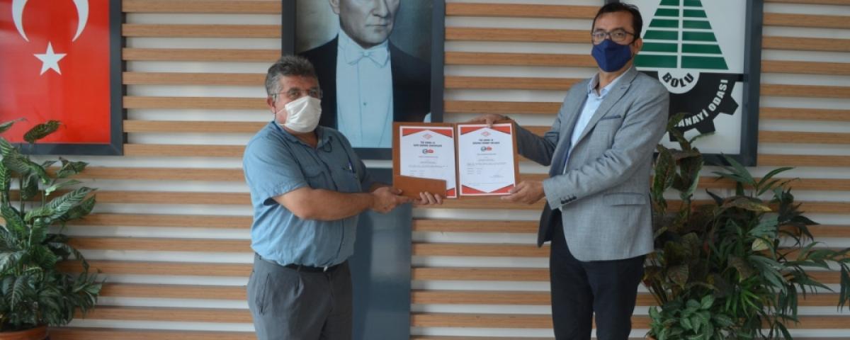 TSE Covid-19 Güvenli Hizmet Belgesi, TSE Bolu İl Temsilcisi A. Mithat Yılmaz tarafından TSO Genel Sekreteri İsmail Gören'e takdim edildi.