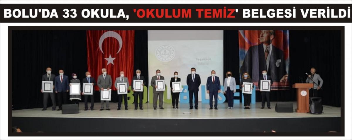 Milli Eğitim Bakanlığı'nın başlattığı ‘Okulum Temiz' projesi kapsamında “Milli Eğitim Bakanlığı ile Türk Standartları Enstitüsü (TSE) arasında, 27 Temmuz 2020 tarihinde imzalanan “Eğitim Kurumlarında Hijyen Şartlarının Geliştirilmesi ve Enfeksiyonu Önleme İş Birliği Protokolü” gereğince, hijyen şartlarının geliştirilmesi, enfeksiyon önleme ve kontrol süreçlerinin tutarlı, geçerli, güvenilir, tarafsız bir anlayışla sürdürülmesi amacıyla “Okulum Temiz” belgesini almaya hak kazanan 33 okulla belgeleri 2020-2021 Eğitim Öğretim Yılı Okul/Kurum Müdürleri toplantısında Bolu Valisi Ahmet Ümit tarafından verildi.