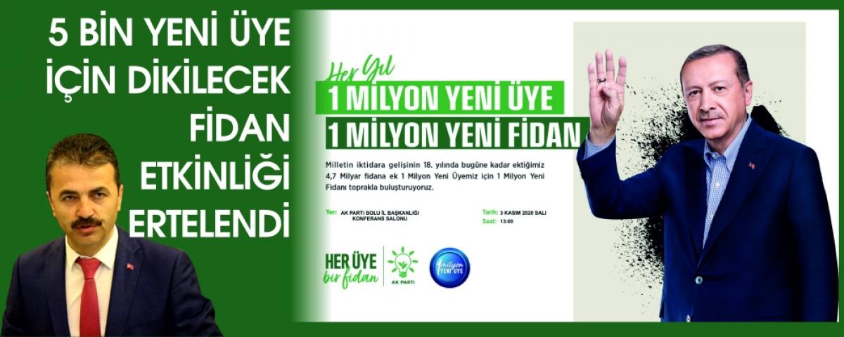 AK Parti Bolu İl Başkanı Nurettin Doğanay, 'Gönül Seferberliği Kampanyası' kapsamında Bolu'da her üye için birer fidan dikeceklerini ifade etti. Doğanay açıklamasında, “Bolu AK Parti Teşkilatları olarak Ailemize katılan 5 bin yeni üyemiz için Kürkçüler TOKİ Memur Konutları bölgesinde ve Dörtdivan'da geçtiğimiz ay çıkan yangın sonucu yok olan ormanlık alana fidan dikeceğiz” ifadelerini kullanmıştı. AK Parti Bolu İl Başkanlığı, İzmir'de meydana gelen ve birçok vatandaşımızın olumsuz etkilendiği deprem dolayısıyla ‘Her Üye Bir Fidan, Bir Milyon Yeni Üye' programını ileri bir tarihe ertelediğini duyurdu. Yapılan açıklamalarda, “3 Kasım tarihinde yapmayı planladığımız ‘Her Üye Bir Fidan, Bir Milyon Yeni Üye' programımızı İzmir'de yaşanan deprem sebebiyle ileri bir tarihe erteliyoruz. Kamuoyuna saygıyla duyururuz” ifadeleri yer aldı.