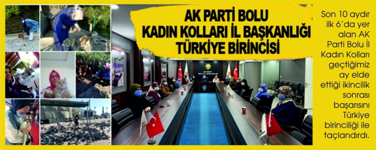 Son 10 aydır ilk 6'da yer alan AK Parti Bolu İl Kadın Kolları geçtiğimiz ay elde ettiği ikincilik sonrası başarısını Türkiye birinciliği ile taçlandırdı. Konu ile ilgili açıklamada bulunan AK Parti Bolu İl Kadın Kolları Başkanı Hicran Çağalı, “Bolu Kadın Kolları olarak, çok şükür Ekim ayında 81 İl içinde performans değerlendirmesinde Türkiye birincisi olduk. Son 10 aydır zaten ilk 6'da yer alıyorduk ve gözümüzü yükseklere ilk sıralara ve hatta birinciliğe dikmiştik. Bu amaçla Cumhurbaşkanımız, Liderimiz Sayın Recep Tayyip Erdoğan'ın davasında hedefe kilitlenmek, inanmak, azmetmek, Allah'a güvenerek O'nun rızası üzerine davaya hizmet için canla başla çalışıyoruz” ifadelerini kullandı.