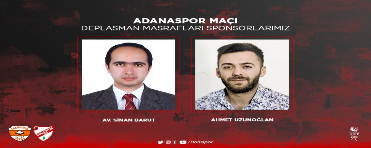 Kırmızı beyazlıların resmi internet sitesinden yapılan açıklamada; “TFF 1. Lig 11. Haftasında deplasman oynayacağımız Adanaspor karşılaşmasının sponsorları Başkan Yardımcımız / Bolu Belediyespor Başkanı Av. Sinan Barut ve Yönetim Kurulu Üyemiz Ahmet Uzunoğlan oldu. Adanaspor deplasmanı sponsorlarımız olan Av. Sinan Barut ve Ahmet Uzunoğlan'a (Bolu Dağı Cafer Usta Restaurant) teşekkürlerimizi sunuyoruz.” ifadelerine yer verildi.