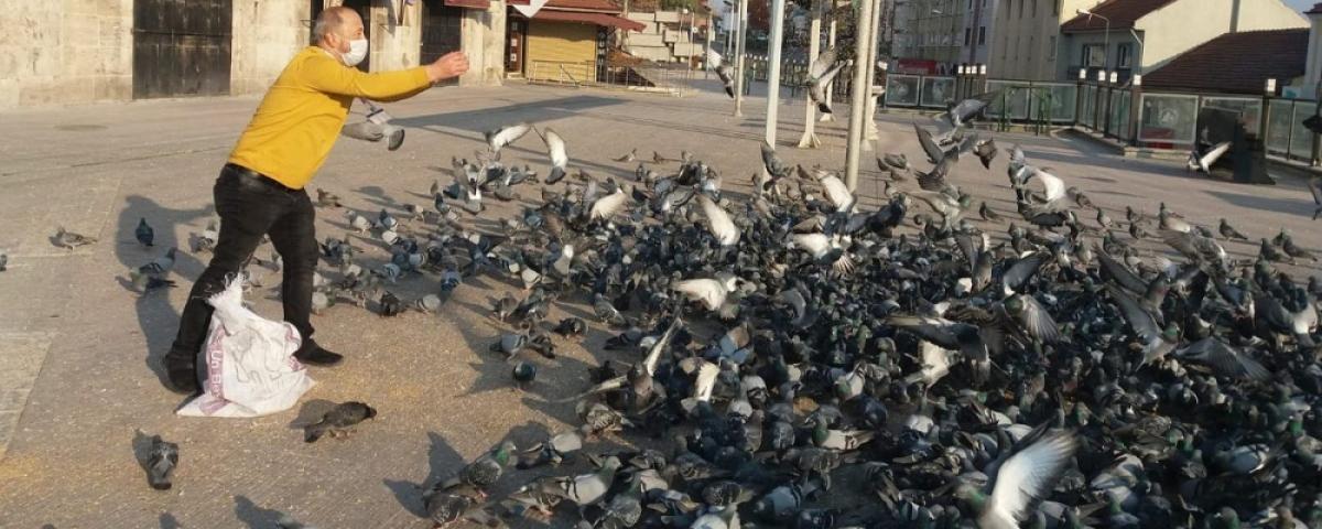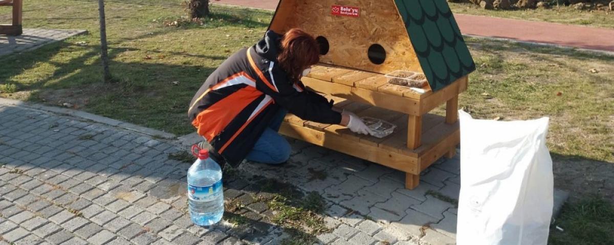 Özellikle tüm mahallerdeki kedi ve köpek evlerine yem ve su bırakan ekipler, ayrıca Büyük Camii etrafında toplanan yüzlerce güvercini de unutmayarak buğdayla besledi.