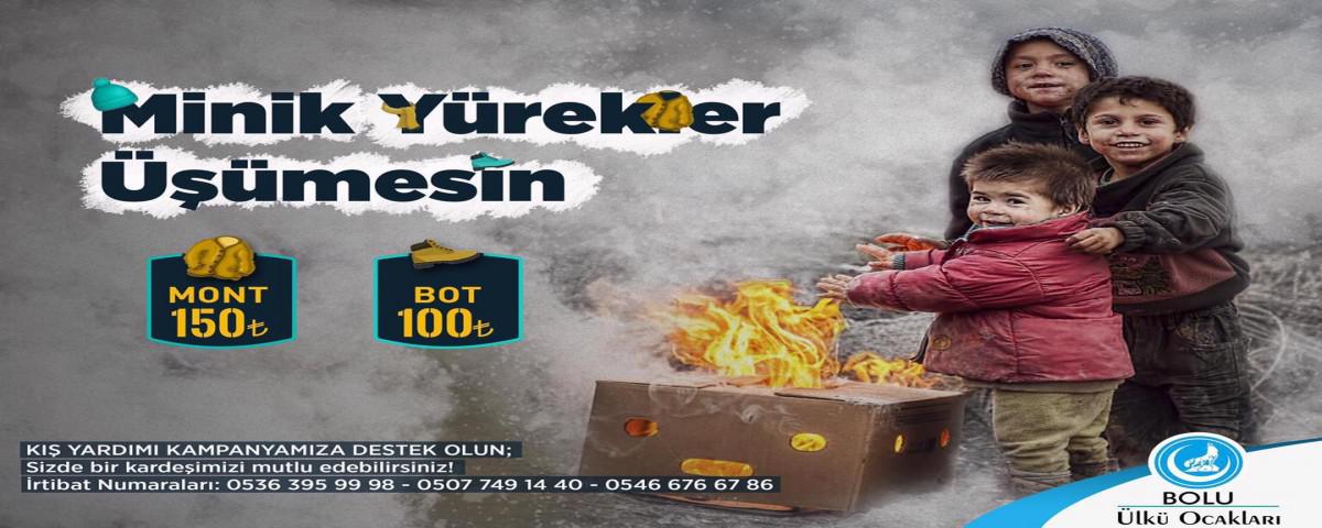 Bolu Ülkü Ocakları ‘Minik Minik Yürekler Üşümesin' kampanyası ile mağduriyetleri azaltarak Minik Yürekleri ısıtmak adına ihtiyaç sahibi çocukların kışlık bot ve mont ihtiyaçlarının karşılanmasında destek olacak. Kampanya ile ilgili açıklama yapan Bolu Ülkü Ocakları Başkanı İsmail Akgül, “Soğuk kış aylarına girdiğimiz bugünlerde, evine, çoluk çocuğuna helal lokma getirmek için ağır işlerde çalışıp, aldığı ücretlerle kıt kanaat geçinmeye çalışan vatandaşlarımız, bu zorlu hayat şartları altında yaşamaya çalışırken, bir taraftan da kış ayının getirdiği zorluklarla mücadele etmeye çalışmaktadır. Hanesinin günlük ihtiyaçlarını karşılamakta zorlanan vatandaşlarımız, kışın getirdiği ısınma ve beslenme maliyetleri ile daha büyük sıkıntılar yaşamaktadır. Bolu Ülkü Ocakları olarak Efendimiz Hz. Muhammed'in ‘Komşusu aç iken tok yatan bizden değildir' Hadisi Şerifini düstur edinerek, bu soğuk kış aylarında, ısınmak için üstüne giyecek bir mont bulamayan, ıslanan ve üşüyen ayaklarını korumak için bir botu bulunmayan, ihtiyaç sahibi ailelerimizin çocuklarına yardım etmek ve onları bir nebzede olsa mutlu etmek için ‘Minik Yürekler Üşümesin' sloganıyla başlattığımız yardım kampanyamıza tüm vatandaşlarımızın desteğini talep ediyoruz” şeklinde konuştu.
