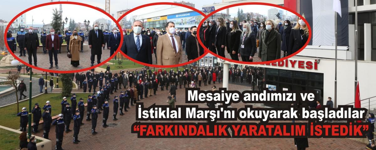 Milli Eğitim Bakanlığı'nın 11 Ocak Pazartesi günü saat 10.00'da tüm Türkiye'de aynı anda İstiklal Marşı okunması talimatına Bolu Belediyesi'nden destek geldi. İki günlük hafta sonu tatilin ardından tüm personeller ve Başkan Yardımcıları, Bolu Belediye Başkanı Tanju Özcan'ın çağrısına uyarak belediye binası önünde toplandı. Bolu Belediye Başkanı Tanju Özcan, Başkan Yardımcıları ve personeller, Başkanlık Sözcüsü Rasim Özdemir'in sevk ve idaresinde, hep bir ağızdan önce Andımızı, ardından da bir dakikalık Saygı Duruşunda bulunduktan sonra İstiklal Marşı'nı okudular. Bu esnada belediye önünden geçenler ile bankalar önünde sıra bekleyen vatandaşlar da Bolu Belediyesi personellerine destek verdiler.