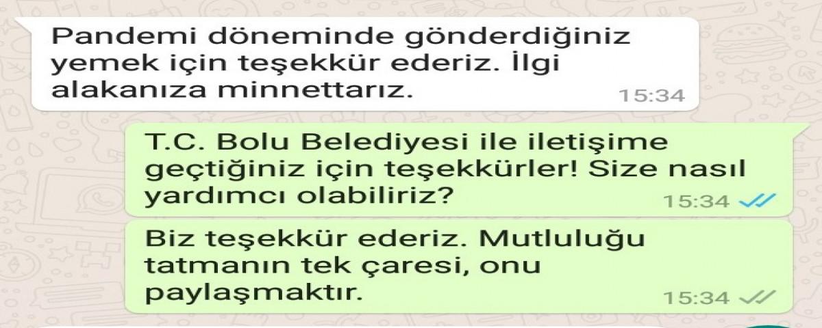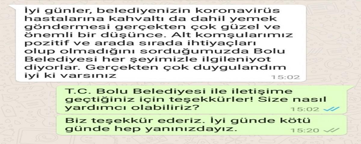 Bolu Belediyesi'nin Covid-19 hastalarına ve temaslı kişilere sunduğu yemek hizmeti Bolululardan büyük takdir görüyor. 14 günlük karantina süresi boyunca evlerine yemek götürülen vatandaşlar, Bolu Belediyesi WhatsApp hattına gönderdikleri mesajlarla zor günlerinde kendilerini yalnız bırakmayan ve yemek ihtiyaçlarını gideren Bolu Belediye Başkanı Tanju Özcan ve belediye ekiplerine teşekkürlerini sunuyorlar.