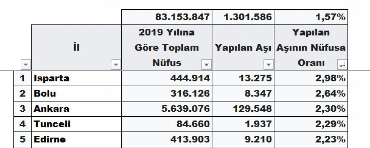 Resmi kayıtlara göre, 81 il arasında Bolu, nüfusa oranla en çok aşı yapılan 2. il oldu. 316 bin nüfuslu Bolu'da bugüne kadar 8 bin 347 kişiye aşı yapıldığı kaydedildi. İl nüfusunun 2,64'ünün aşılandığı belirtilen çizelgeye göre Bolu, bu oranla ikinci sırada yer alırken birinci 2,98 ile Isparta oldu.