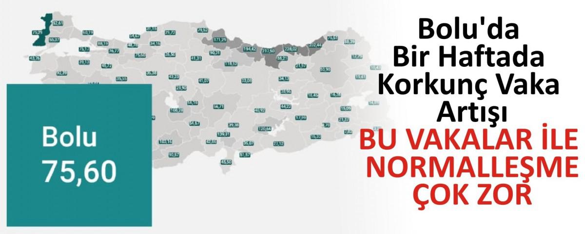 Sağlık Bakanı Fahrettin Koca, sosyal medya hesabından 81 ilin haftalık vaka sayısını paylaştı. Bakan Koca'nın paylaştığı vaka verilerine göre Bolu'da 8-14 Şubat arasında her 100 bin kişide 44,96 olan vaka sayısı 15-21 Şubat arasında 75,60 oldu. Mart ayında geçilecek olan normalleşme öncesi Bolu'da bir haftada artış gösteren vaka sayıları korkutur durumda.