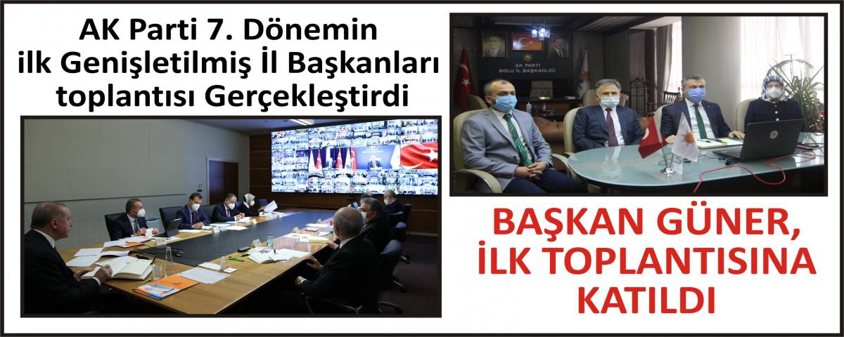 Ak Parti Bolu İl Başkanı Suat Güner, Cumhurbaşkanı Recep Tayyip Erdoğan'ın video konferans yöntemi ile katılım sağladığı 7. Dönemin ilk Genişletilmiş İl Başkanları toplantısına katıldı. Genişletilmiş İl Başkanları toplantısına İl Başkanı Suat Güner ile birlikte AK Parti Bolu Kadın Kolları Başkanı Hicran Çağalı, AK Parti Bolu Gençlik Kolları Başkanı Fatih Bayrak ve İGM Başkanı Yaşar Yüceer katıldı.