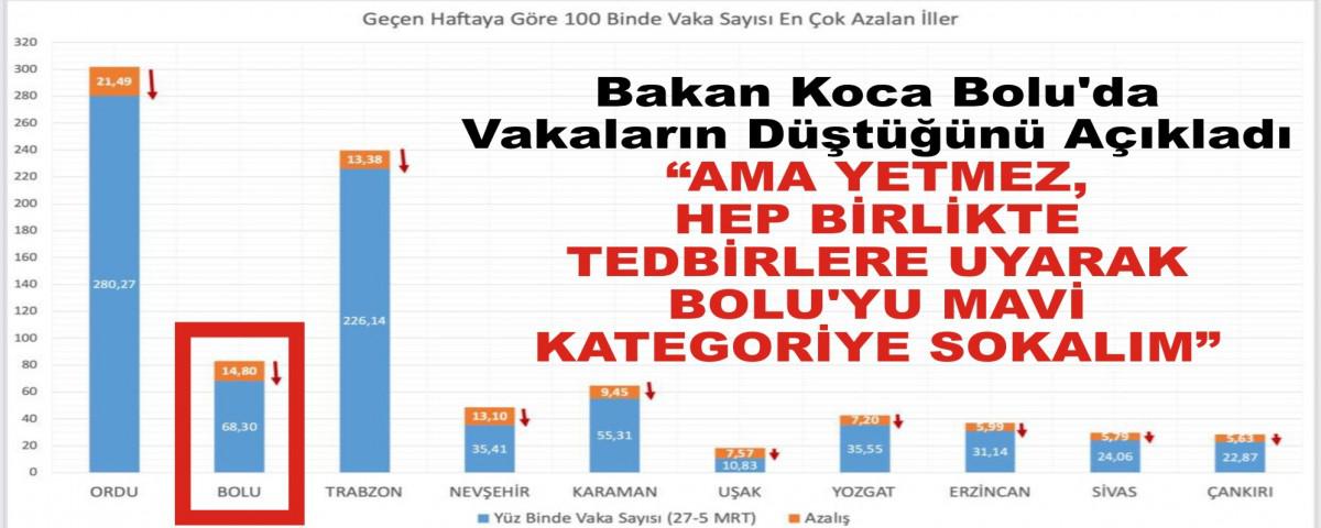 Sağlık Bakanı Fahrettin Koca, son haftada 100 bin nüfusta vaka görünme oranına göre en çok artan illeri ve en çok azalan illeri açıkladı. Bakan Koca'nın açıklamalarına göre Bolu vaka sayıları azalan iller arasında yer aldı.