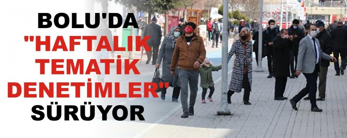 İçişleri Bakanlığı tarafından 81 il Valiliğine gönderilen "Haftalık Tematik Denetimler" genelgesi kapsamında Bolu'da 750 ekip ve 2561 personelin yürüttüğü kuaför, berber, güzellik merkezi, hamam, sauna, masaj salonu, internet kafeler/salonları, düğün ve/veya nikâh salonları, lunapark/tematik parklar, ganyan, ı̇ddaa ve milli piyango bayilerinde denetimler gerçekleşti.