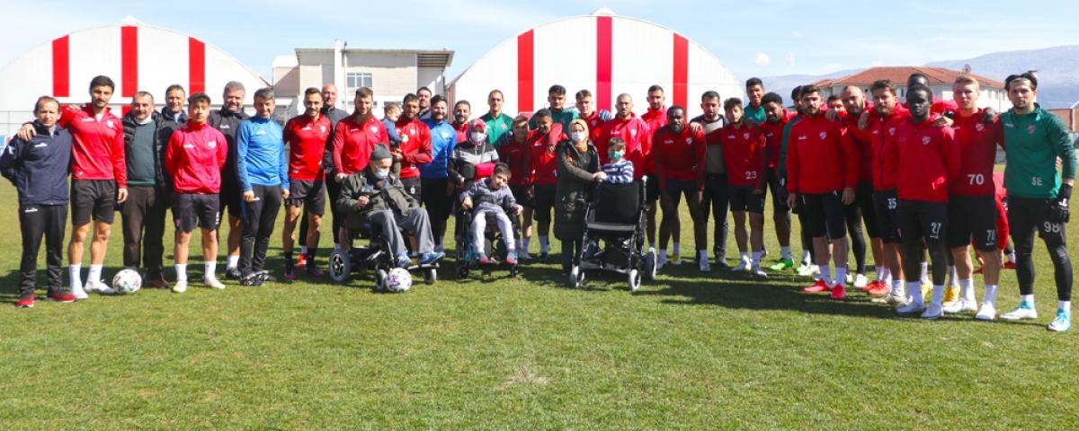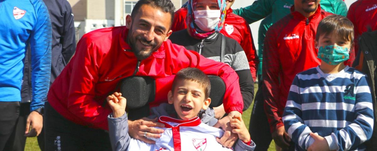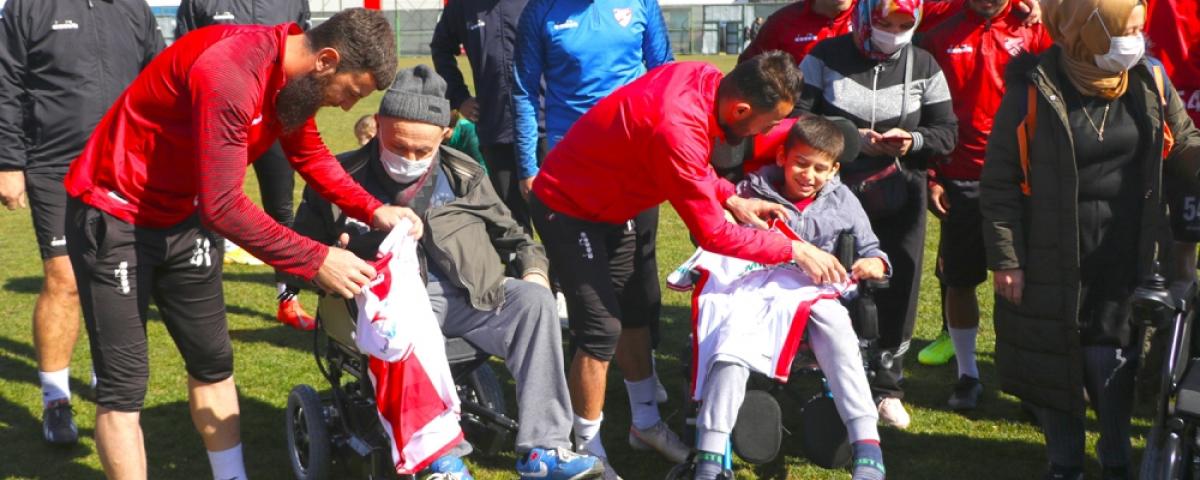 Tekerlekli sandalyelerine kavuşan vatandaşlar büyük mutluluk yaşadı. Engelli vatandaşlara kırmızı beyazlı oyuncular forma hediye ettiler. Kırmızı beyazlı takım sosyal medya hesabından diğer takımlara da örnek olması amacıyla ilk olarak Adana Demirspor'a çağrıda bulunuldu