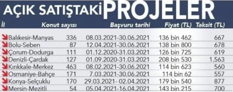 Yeni açıklamayla birlikte, çekiliş ve kura şartı olmayan, sekiz şehirde bulunan, bin 365 yeni konut satışa sunuldu. Kuralı satışlarla birlikte toplam 2 bin 770 konut için fırsatlar devam ediyor.