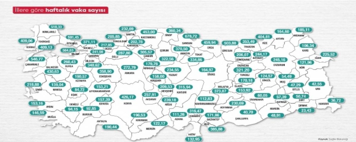 Haftalık verilere göre, ülke genelinde Samsun her 100 bin kişide 678,72 vaka sayısıyla, İstanbul 591,45 vaka sayısıyla en yüksek artış sağlayan iller oldu.