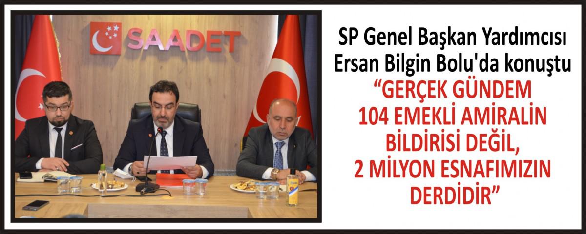 Saadet Partisi Genel Başkan yardımcılarından Ersan Bilgin, Bolu Saadet Partisi İl Teşkilatı ile bir araya geldi. Ersan Bilgin il teşkilatı ile görüşmelerinin ardından basın mensuplarının karşısına geçti. Ersan Bilgin yaptığı açıklamada, “Kanaatimize göre bugün asıl konuşulması gereken, gerçek gündem 104 emekli Amiralin bildirisi değil, 2 Milyon esnafımızın derdidir, geçinemeyen emeklinin, 83 milyon vatandaşımızın derdidir” ifadelerini kullandı.