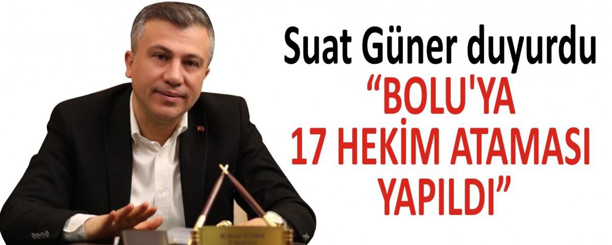 Söz konusu hedefler doğrultusunda Bolu'ya 17 doktor ataması yapıldığının müjdesini veren Suat Güner, “Devlet Hizmeti Yükümlülüğü (DHY) ataması ile ilimize 1 beyin cerrahi, 1 çocuk nöroloji, 1 yoğun bakım, 1 göz branşında olmak üzere 4 uzman hekim ile 13 pratisyen hekim olmak üzere toplamda 17 hekim ataması yapıldı. Bolu'muzda göreve başlayacak olan hekimlerimize ve Bolulu hemşerilerimize hayırlı uğurlu olsun. Bu atamalarda emeği geçen Cumhurbaşkanımız Recep Tayyip Erdoğan'a, Sağlık Bakanımız Fahrettin Koca'ya ve milletvekillerimiz Arzu Aydın ile Fehmi Küpçü'ye teşekkür ediyorum” ifadelerini kullandı.