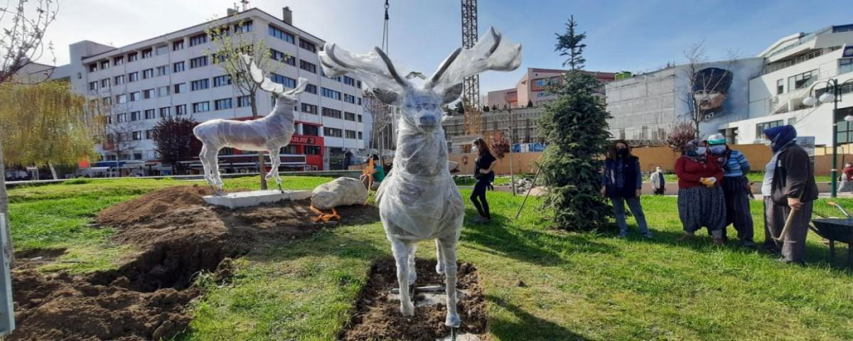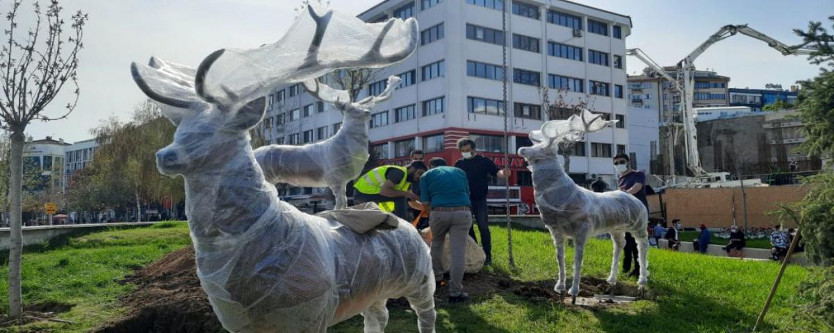 Bolu Belediyesi tarafından Demokrasi Meydanı'nda yapılan yeni çevre düzenlemesine ilave olarak yeşil alanlara geyik heykelleri yerleştirildi.