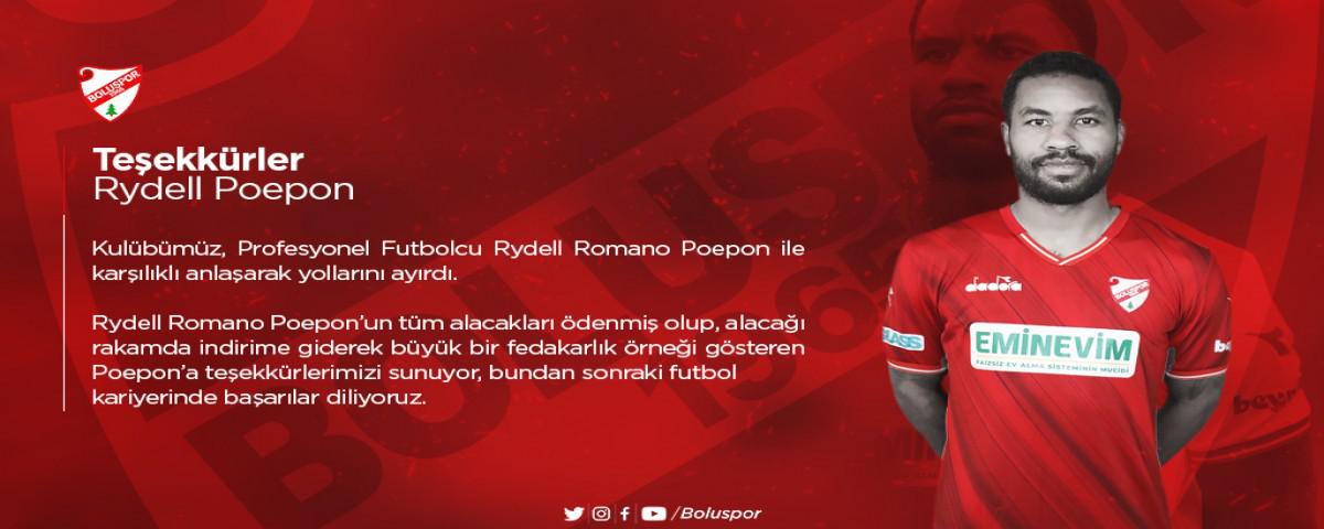 Beypiliç Boluspor, 33 yaşındaki Hollandalı forvet Rydell Poepon ile karşılıklı anlaşarak yolları ayırdı. Bu sezon Boluspor forması ile çıktığı 18 karşılaşmada gol ve asist üretemeyen Poepon, çıktığı karşılaşmalarda 3 sarı kart gördü. 33 yaşındaki oyuncu ligin son haftasında oynanan Eskişehirspor karşılaşmasında sonradan oyuna girmişti.