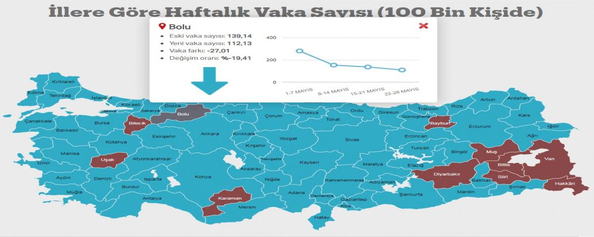 Sağlık Bakanı Fahrettin Koca, illere göre 100 bin nüfustaki vaka sayısını içeren haritayı paylaştı. Haritaya göre ülkemiz genelinde vaka sayılarında önemli bir düşüş kaydedildi. Bakan Koca tarafından açıklanan haritaya göre ilimizde 100 bin nüfusta 15-21 Mayıs haftasında 139,14 olan vaka sayısı 22-28 Mayıs haftasında bekleneni vermedi. 22-28 Mayıs haftası haritasına göre ilimiz Bolu'da 100 bin nüfustaki vaka sayısı 112,13 olarak gerçekleşti. Son açıklanan haftalık vaka sayısına göre ayrıca ilimiz Bolu ülkemizde 100 bin nüfustaki haftalık vaka sayısının en yüksek olduğu 6. il oldu. Birinci sırayı 162,31 ile Gümüşhane alırken ikinci sırayı 146,76 ile Bilecik, üçüncü sırayı 118,63 ile Kars, dördüncü sırayı 115,71 ile Ankara, beşinci sırayı 112,71 ile Kütahya aldı.