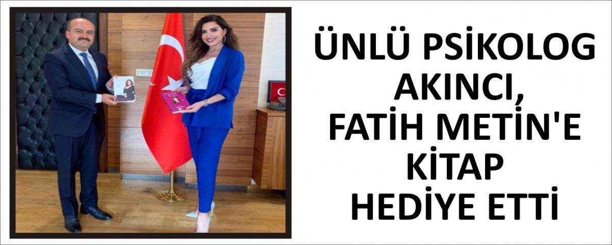 Ziyareti sosyal medya hesabından paylaşan Akıncı, Sayın Bakan Yardımcı'mız Fatih Metin beyefendiyi Ankara'da ziyaret ettim. ‘Gözyaşı Şişeleri' ve ‘Mutluluğu Seçtim Ya Sen' kitaplarımı kendilerine takdim ettim. Çok değerli misafirperverliğinden dolayı teşekkür ediyorum” ifadelerini kullandı.