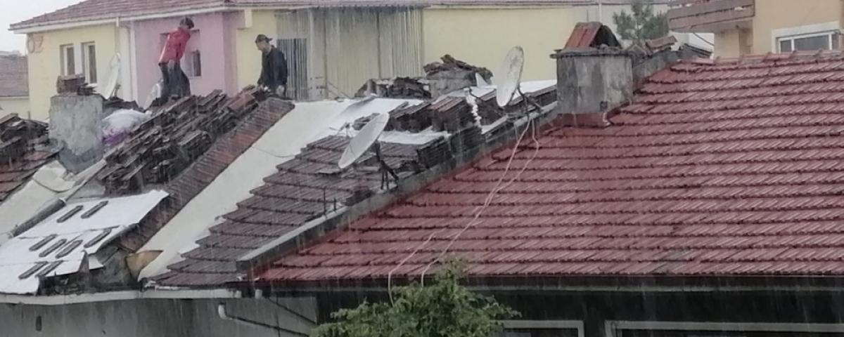 Bolu'da, Meteoroloji Müdürlüğü'nün uyarılarının ardından sağanak yağmur bastırdı. Sağanak yağmurun bastırması ile beraber kentin işlek caddelerinden İzzet Baysal Caddesi'nde bulunan bir binanın tepesindeki işçiler dikkat çekti. Soğuk ve yağmurlu havaya rağmen binanın tepesinde çatı onarımını yapmaya devam eden evlerine ekmek götürmek için çalışan işçiler görüntüsü yürek ısıttı.