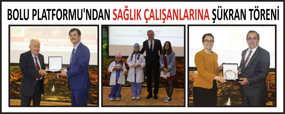 Pandemi döneminde ilimizde yaptığı başarılı çalışmalar nedeniyle taraflı tarafsız tüm kesimlerin takdirini toplayan Bolu İl Sağlık Müdürü Dr. Muhammed Emin Demirkol ise, “Böyle bir şükran programında bulunmaktan büyük bir mutluluk duyduğumu bildirerek sözlerime başlamak istiyorum. Bu zorlu süreçte Bolu'daki sağlık ordusunun başında olmayı Allah bize nasip etti. İnşallah yaptığımız hayırlı hizmetler ahirette karşımıza çıkar. Bu sağlık ordusunun başında olduğum sürece çok övgüler aldık. Ben bütün çalışanlarımıza, gecesini gündüzüne katan personellerimize teşekkür ediyorum. Bizlere her türlü desteği veren tüm kesimlere ve bu özel programı düzenleyen Bolu Platformu üyelerine teşekkür ediyorum.” diyerek düşüncelerini dile getirdi. Bolu Belediye Başkan Yardımcısı Rasim Özdemir de , “Bolu Belediyesi olarak pandemi döneminde sağlık çalışanlarımızın her zaman yanında olduk. Sağlık çalışanlarına ücretsiz araç tahsisleri yaptık. Sadece sağlık çalışanlarımıza değil vatandaşlarımıza bu süreç içerisinde birçok hizmette bulunduk. Sağlık çalışanlarımız için ne yapsak azdır. Yaptıklarımız onların emeğini karşılamaz. Onların bu süreçteki özverilerine ben bizzat şahit oldum. Koronavirüse yakalandığım süreçte ve yoğun bakımda kaldığım süreçte seferber oldular. Onlara ne kadar teşekkür etsek azdır. Bolu Belediyesi olarak Bolu Platformu'na da teşekkür ediyorum. Bundan sonraki projelerinde belediye olarak destekçileri olacaklarımızı bildiriyorum” ifadelerini kullandı. Ödül töreninde sağlık çalışanlarının ailelerinin sesi olarak , sağlık çalışanı yakınları Nil Peri Çalış ve Aslı Bahar Çelebi, izleyicilerle kendi duygularını paylaştılar. Erhan Körçoban ve Zafer Yıldırım ise, koronaya yakalanarak hastalığı yaşamış vatandaşlar adına söz alarak sağlık çalışanlarına teşekkür ettiler. Bolulu ressam Gülfidan Hitit Biçer de Bulgaristan 'da yapılan yarışmada 1.olan eserini Sağlık Müdürlüğü çalışanlarına hediye etti.