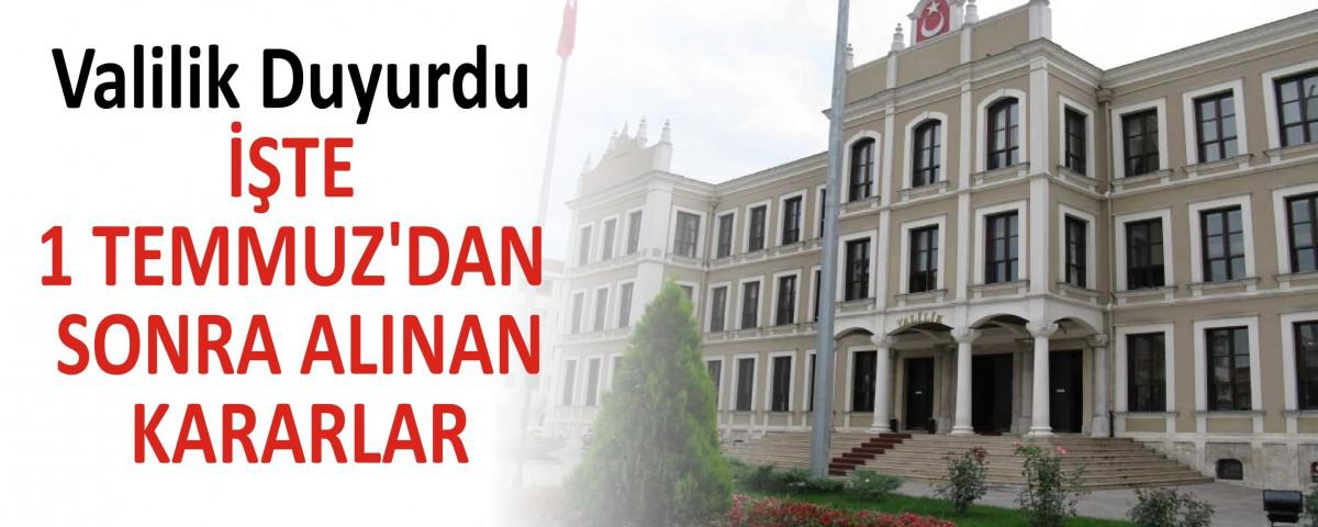 T.C. İçişleri Bakanlığı'nın 8878 sayılı genelgesinde ve İl Umumi Hıfzıssıhha Meclisi 38 nolu kararında belirtilen esaslar çerçevesinde halihazırda uygulanmakta olan sokağa çıkma kısıtlamalarının (hafta içi ve hafta sonu dâhil) 1 Temmuz 2021 Perşembe günü saat 05.00'e kadar sürdürülmesine,