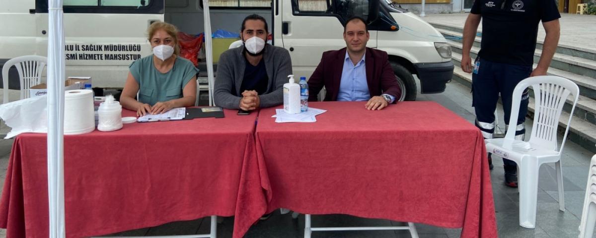 Aşılama çalışmalarında önemli bir yol kat eden kentimizde, sağlık çalışanları kurulan stantlarla vatandaşları aşı olaya davet ediyor. Bolu Ülkü Ocakları Başkanı Cihan Özkalem ve yönetim kurulu üyeleri, pandemin başından bu yana özveriyle mücadele eden sağlık personelini unutmadı. Aşılama çalışmaları kapsamında Vilayet Meydanı'nda kurulan stantta görev yapan sağlık personelini ziyaret eden Ocak Başkanı Özkalem, personele tatlı ikramında bulundu.