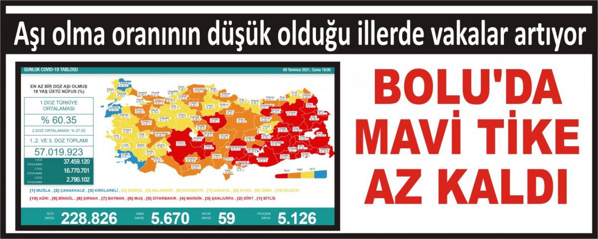 Sağlık Bakanı Fahrettin Koca'nın açıkladığı aşı tablosunda Bolu, yüzde 67 ile mavi il olmaya az kaldı. Aşılamanın yüzde 75 olduğu iller haritada mavi renk ile gösteriliyor.