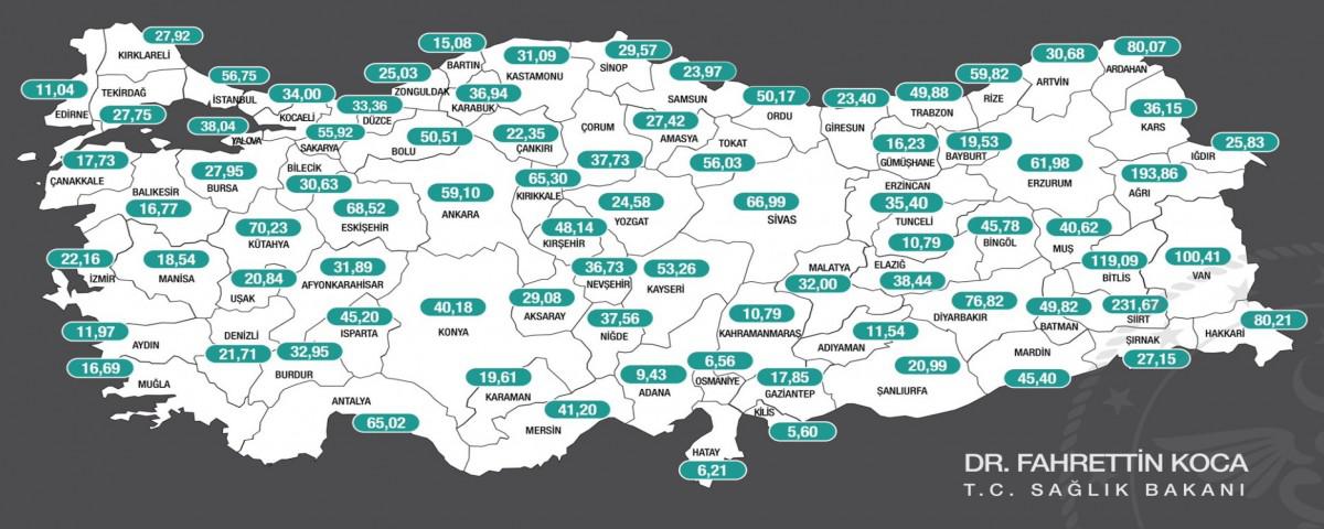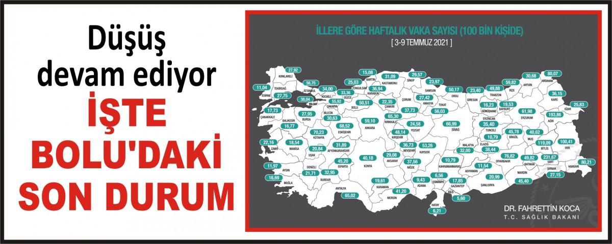 Sağlık Bakanı Fahrettin Koca, illere göre 03- 09 Temmuz her 100 bin kişide görülen Covid-19 vaka sayılarını açıkladı. Koca, Twitter hesabından yaptığı paylaşımda, il bazında 100 bin nüfusa karşılık gelen Covid-19 vaka sayılarına yer vererek, aşı ile umudun arttığını ve aşı olmayan herkesi aşı olmaya davet ettiğini dile getirdi. Normalleşme sürecinin devam ettiği Bolu'da da vaka sayıları Türkiye genelinde olduğu gibi eski haline oranla daha iyi durumda.