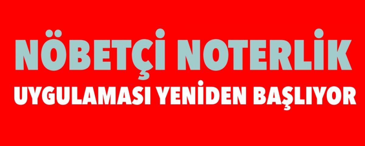 Adalet Bakanlığı'ndan yapılan yazılı açıklamaya göre, noterlik hizmetlerinin daha etkin, verimli ve hızlı yürütülmesi amacıyla 6 Nisan 2019 tarihinde başlatılan nöbetçi noterlik uygulamasına, Koronavirüs tedbirleri kapsamında 17 Mart 2020'de ara verildi. Halktan gelen yoğun talep ve 30 Haziran'da Resmi Gazete'de yayımlanan 'Covid-19 Kapsamında Kamu Kurum ve Kuruluşlarında Normalleşme ve Alınacak Tedbirler ile İlgili 2021/13 Sayılı Cumhurbaşkanlığı Genelgesi' doğrultusunda hafta sonu hizmet verilen nöbetçi noterliğin tekrar başlatılmasına karar verildi. Cumartesi ve pazar günü itibarıyla yeniden başlayacak uygulama kapsamında nöbetçi noterler, 10.00-16.00 saatlerinde gerekli önlemleri alarak hizmet verecek.