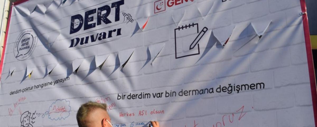 “Bu bağlamda ‘Dert Duvarı' ve ‘Dert Mikrofonu' çalışmalarımızla başta geleceğin mimarı olacak olan gençler olmak üzere, tüm vatandaşlarımızın dertlerini dinlemeye geldik. İster dert mikrofonumuza anlatsınlar isterlerse dert duvarımıza yazsınlar hiç fark etmez bizler onların dertlerine ortak olmaya ve destek olmaya geldik. Bizler bu ortamda günümüzü kurtarmaya, geleceğimizi inşa etmeye çalışırken; yanlış eğitim, ekonomi ve siyasi politikalarıyla hepimizi zor durumda bırakan iktidar, algı yönetimiyle de bizleri gerçek gündemlerimizden uzaklaştırmaya çalışıyor bununda farkındayız.”