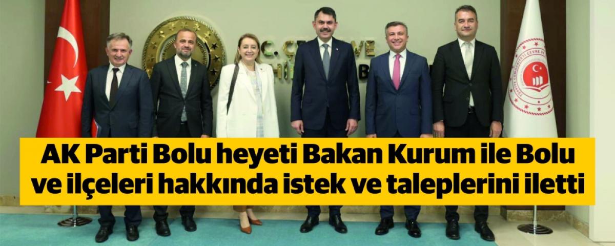 AK Parti Bolu heyeti Bolu için Ankara'ya çıkartma yaptı. Ankara'da bir araya gelen AK Parti Bolu Milletvekili Arzu Aydın, AK Parti Bolu Milletvekili Fehmi Küpçü, AK Parti Bolu İl Başkanı Suat Güner, İl Genel Meclis Başkanı Yaşar Yüceer ve Belediye Meclis Üyesi İsmail Yerlikaya Çevre ve Şehircilik Bakanı Murat Kurum'u makamında ziyaret etti. Makamında Bakan Kurum'u ziyaret eden AK Parti heyeti Bolu ve ilçelerinin taleplerini ve isteklerini Bakan Kurum'a aktardı.