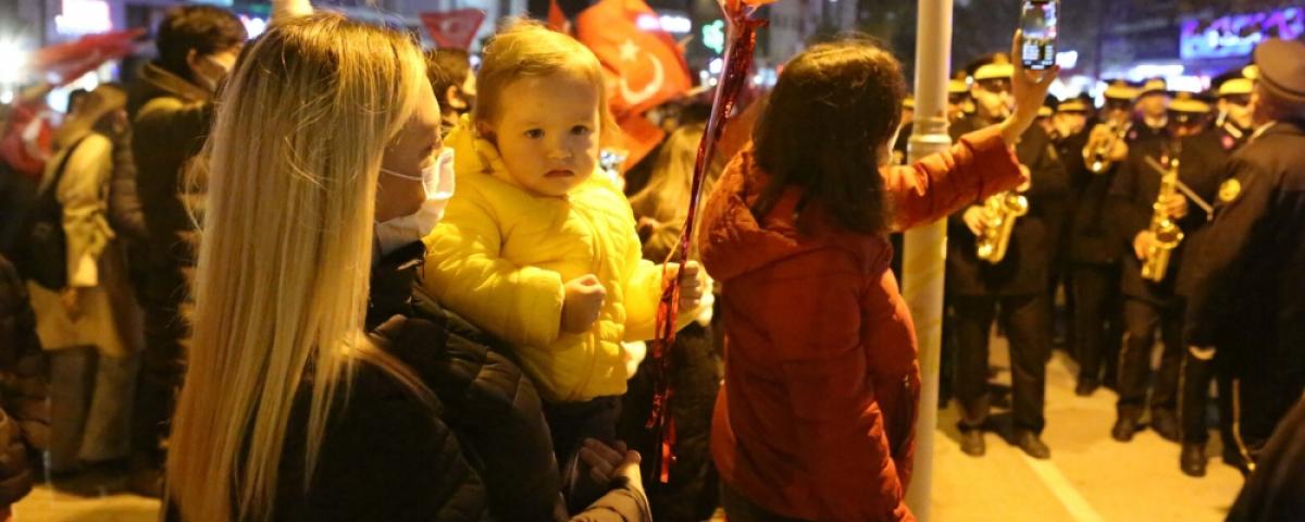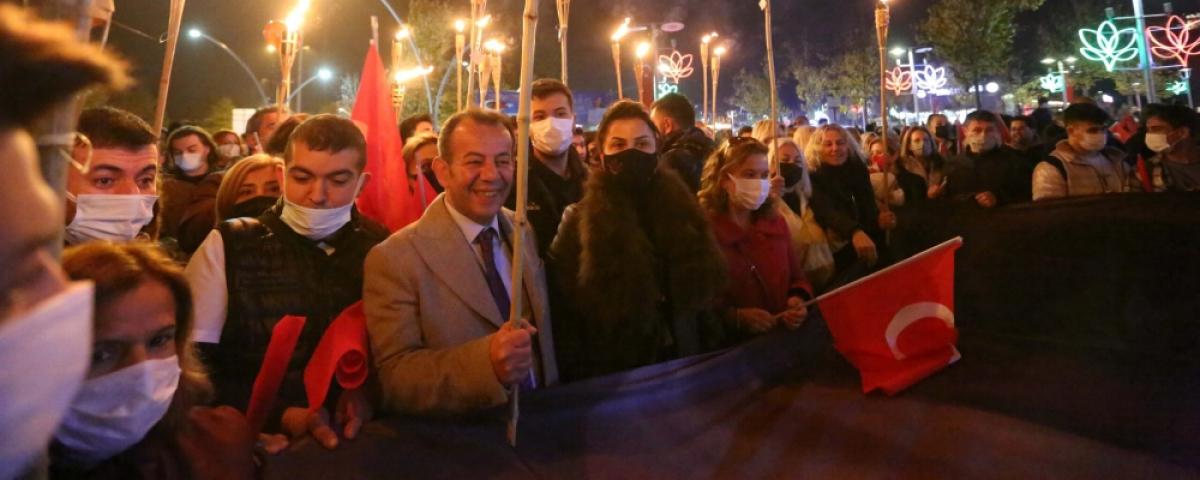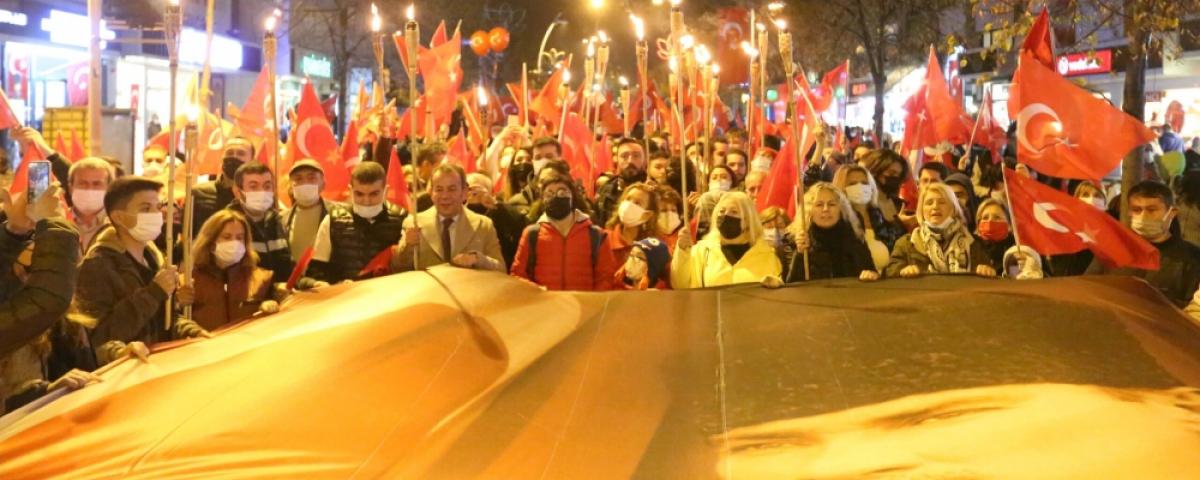 Kalabalığın önünde dev Atatürk posteri ve Türk bayrağın açıldı. Bolu Belediye Başkanı Tanju Özcan ve eşi Meral Özcan'da, Fener Alayı'nda Cumhuriyetin 98. yılını Bolulularla birlikte coşkuyla kutladı. Coşkulu Fener Alayı'nın ardından Bolu Belediyesi tarafından düzenlenen kutlama etkinlikleri, belediye önündeki “Derya Uluğ” konseri ile devam etti.