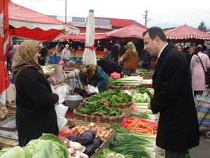 Seçim çalışmalarına ara vermeden devam eden CHP Belediye Başkan Adayı Tanju Özcan, Belediye Meclis Üyesi Adayları ile birlikte Pazaryerini gezdi. Vatandaşlar ile sıcak sohbet eden esnafın ve tüketicinin sıkıntılarını dinleyen Özcan, burada pazaryeri ile ilgili yapacakları çalışmaları da aktardı. Her hafta Pazaryerini etap etap dolaştıklarını belirten ve bu sayede her esnaf ile konuşma fırsatı bulan Özcan, bura ile ilgili en önemli projesinin otopark olduğunu belirtti. Esnafın ilgisinin de her hafta daha çok arttığını belirten Özcan, ?Biz Pazaryerini etap etap her hafta dolaşıyoruz. Her geldiğimizde de vatandaşımızın ilgisinin arttığını, esnafımızın ilgisinin daha bir yoğunlaştığını görüyoruz ve bundan da mutluk duyuyoruz. Ancak burası ile ilgili bizleri üzen bir konu var. Esnaf zaten ekonomik kriz sebebiyle, Bolu?ya sorumsuzca açılan marketler sebebiyle Pazar esnafımız oldukça büyük bir sıkıntıya düşmüş. Birde Alaaddin Yılmaz?ın ?Pazaryerini yıkacağım, yerine 4 katlı 60 triyona mal olacak bir bina yapacağım? söylemi Pazaryeri esnafımızı oldukça sıkıntıya düşürmüş, uykularını kaçırmış. Biz buradan açıkça söylüyoruz, bizim pazaryerini yıkma gibi bir niyetimiz yok. Biz buradaki mevcut binaları koruyarak, yalnızca binaları güzelleştirerek, tezgahları düzenleyerek hakkaniyete uygun bir dağılım sağlayarak pazaryerini ıslah etme projemiz var. Tabi ki pazaryerinin rezerv alanında büyük bir otopark projemiz var. Bu sayede Pazar etrafında oluşan trafik kargaşasını ortadan kaldıracağız. Bunu buradan Bolu Halkına ilan ediyorum. Daha güzel bir pazaryerimiz olacak ve bunu bazı şeyleri yıkmadan, borca girmeden gerçekleştireceğiz.