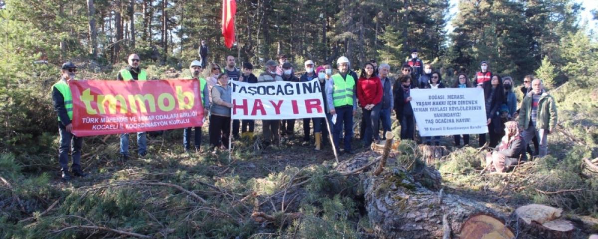 Bolu Kıbrıscık yolu üzerinde bulunan 500 yıllık Ayman Yaylası'nın köylüleribir süredir, yaylaya çok yakın bir mesafede yapılması planlanan taş ocağına karşı hem fiili hem de hukuki mücadelerine devam ediyor. Köylülerin bu mücadelesine bir destek de Türk Mühendis ve Mimar Odaları Birliği (TMMOB) Kocaeli İl Koordinasyon Kurulu (İKK) bileşenlerinden geldi. Yoğun bir katılım ile Ayman yaylasına gelen (TMMOB) Kocaeli İl Koordinasyon Kurulu taş ocağı yapılmak istenen ve yüzlerce ağacın kesildiği alanda keşif yaparak taş ocağının doğaya, hayvancılığa ve burayı yurt edinmiş insanlara ve Bolu'ya getireceği zararları anlatan bir basın açıklaması gerçekleştirdi.