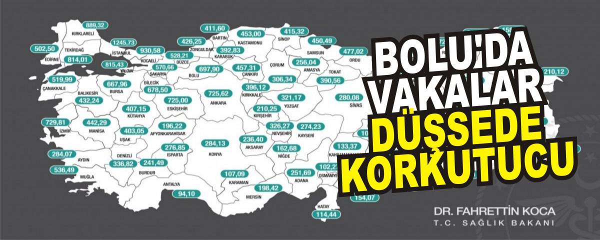 Bakan Koca'nın paylaştığı haritaya göre, Bolu'da 8-14 Ocak tarihleri arasında 708,06 olan haftalık vaka sayısı 15-21 Ocak tarihlerinde küçük bir düşüş ile 697,90 oldu.