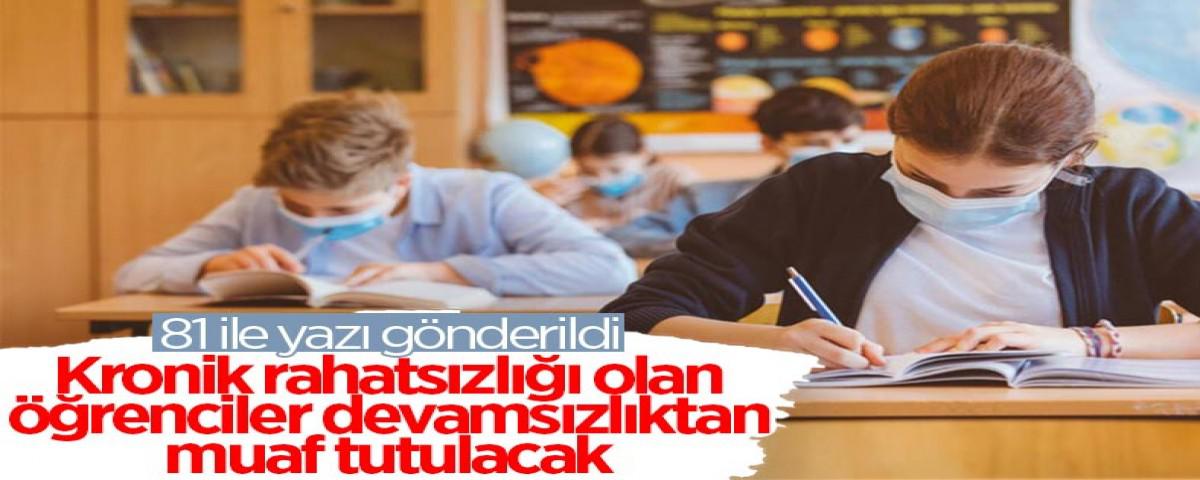 Bu kapsamda, ilköğretim ve ortaöğretime devam eden, kronik rahatsızlığı olan ve bunu sağlık kuruluşlarından aldıkları sağlık kurulu raporuyla belgelendiren öğrenciler ile her tür ve kademede eğitimlerine devam eden özel eğitim ihtiyacı olan öğrenciler için velilerinin yazılı talebi dikkate alınarak ilgili mevzuatta yer alan devamsızlıkla ilgili hükümler uygulanmayacak.