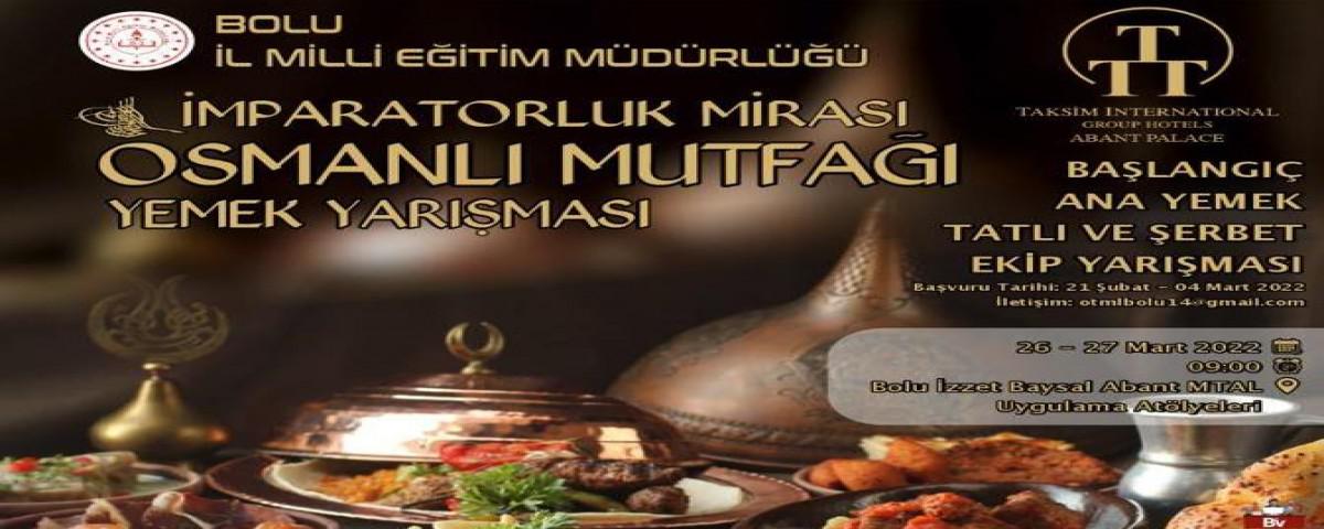 Osmanlı Mutfağı yemek kültürünün tanıtılması, yeni nesillere yarışma ortamı ile aktarılması, sürekliliğinin sağlanması ve Meslek Liselerine ilginin artırılması amacıyla Bolu İl Milli Eğitim Müdürlüğü uhdesinde İzzet Baysal Abant Mesleki ve Teknik Anadolu Lisesi Turizm haftası Etkinlikleri kapsamında “Osmanlı Mutfağı Yemek Yarışması” düzenlenecektir. Yarışma Türkiye Geneli olup Lise Düzeyi Yiyecek İçecek Hizmetleri Alanı olan tüm eğitim kurumları katılabilecektir.