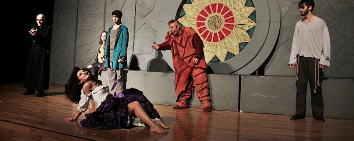 Çirkin ve kambur Kilise zangocu Quasimodo ile Fransa'nın ruhani ve dini lideri Claude Frollo'nun ve Kral'a bağlı komutan Phoebus'un semtte yaşayan çingene Kızı Esmeralda'ya olan aşklarını ele aldığı 2 perdelik müzikali, KGS (Kumbara Görsel Sanatlar) Tiyatrosunun 19 kişilik ekibinden 12 sanatçı sahneledi.