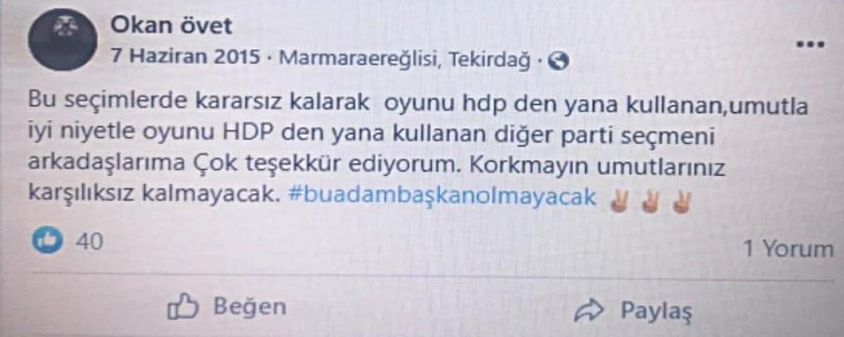 Paylaşımlarında Başkan Özcan'a yüklenen Başkan Güner, Bolu Belediyesi'nin 29 Ekim kutlamaları için -yaklaşık maliyeti 325 milyar TL olan organizasyona- ödeme yaptığı Şirketin yetkilisinin HDP'li olduğunu iddia etti. Organizasyon şirketi yetkilisi Okan Ö.'nün HDP ile ilgili yaptığı paylaşımları paylaşan Suat Güner, Bolu halkının parasının HDP'ye övgü yağdıranların kasasına aktarıldığını belirtti.