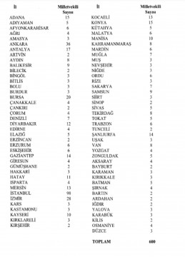 TÜİK verilerinden hareketle 600 milletvekilinin illere göre dağılımının yapıldığı görüldü.