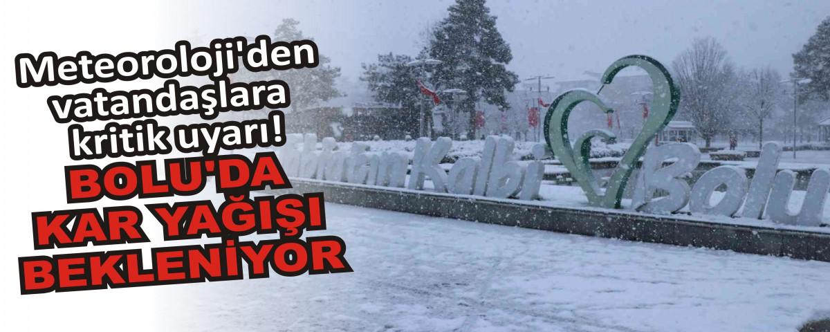 Meteoroloji Genel Müdürlüğü'nce pazartesi akşam saatlerinden itibaren Bolu'nun yüksek kesimlerinde kuvvetli kar beklendiği bildirildi. Genel Müdürlükten yapılan yazılı açıklamaya göre, pazartesi Bolu'da sağanak şeklinde başlayacak yağışın akşam saatlerinden itibaren yüksek kesimlerde yer yer kuvvetli kar yağışına dönmesi bekleniyor. Başta Bolu Dağı Geçidi olmak üzere meydana gelebilecek ulaşımda aksamalar, buzlanma ve don ile tipi gibi olumsuzluklara karşı dikkatli ve tedbirli olunması gerekiyor.