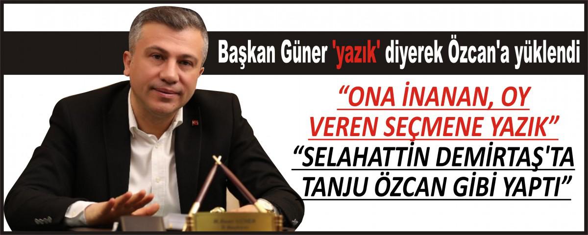 Selahattin Demirtaş ve Tanju Özcan'ın aynı şeyler yaptığını belirten Başkan Güner, “Selahattin Demirtaş aşkına bir şey diyemiyorum. Selahattin Demirtaş'ı farklı değerlendiriyormuş, değerlendirsin merak ediyorum. Selahattin Demirtaş'ta aynısını yaptı Tanju Özcan gibi. Oda saz çaldı milletin gözüne şirin göründü. O günkü barajı açabilmek için o şovu yaptı. Selahattin Demirtaş ‘Biz Aponun heykelini dikeceğiz' diyecek. ‘Kürdistan devleti kuracağız' diyecek. Bu ülkenin birlik beraberliğini bütününe kast edecek cümleler kuracak ben Selahattin Demirtaş ile ilgili farklı düşünüyorum diyeceğim. Böyle bir şey yok. Yazık, ona inanan oy veren seçmene yazık. Onlar adına üzülüyorum. Böyle bir şey yok” ifadelerine yer verdi.