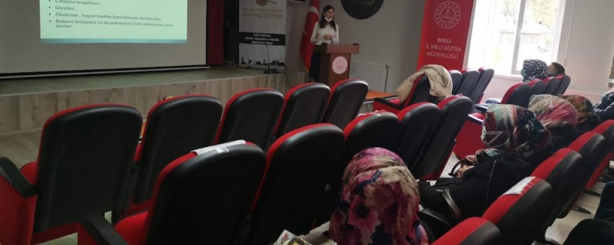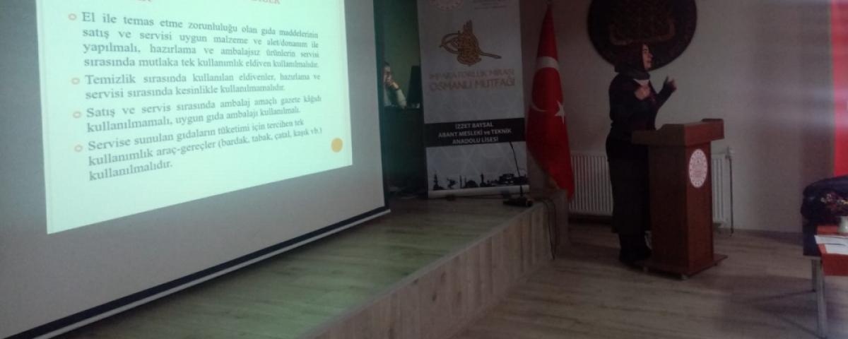 Bu kapsamda, Bolu İl Müdürlüğümüz kontrol görevlileri Gıda Mühendisi Buse YAŞLI ve Gıda Mühendisi Sevim Öztürk Oruç tarafından eğitim kurumlarının kantin ve yemekhane çalışanlarına eğitim verildi. 70 kişinin katıldığı eğitimde gıda işletmelerine ait özel hijyen gereklilikleri, personel hijyeni, gıda maddelerinin depolama, hazırlama, servis ve satış koşulları, okul gıdası vb. konularında bilgilendirmeler yapıldı. Ayrıca İl Sağlık Müdürlüğü personelince de “Hastalıklar ve Bulaşma Yolları, Beslenme” konularında bilgilendirmeler yapıldı. Bolu Abant İzzet Baysal Mesleki ve Teknik Anadolu Lisesinde gerçekleşen eğitimde tüm çalışanlar katılım belgesi almaya hak kazandı.