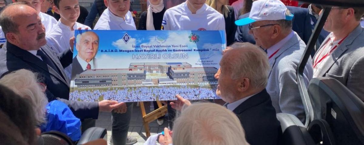 Mengen Belediyesi tarafından açılan standa gelen İzzet Baysal Vakfı Başkanı Ahmet Baysal ile eşi Solmaz Baysal'a Mengen Belediye Başkanı Turhan Bulut, tarafından 14 Mayıs Cumartesi günü devir teslimi yapılacak olan BAİBÜ Mengen Gastronomi ve Aşçılık Meslek Yüksekokulunun resmi hediye edildi.