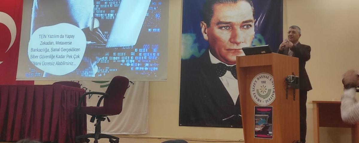 3 farklı ülkede hizmet veren TEİN Yazılım A.Ş.'nin faaliyetleri hakkında öğrencilere bilgi veren İbrahim Aydın; Metaverse, Yapay Zeka, Sanal Gerçeklik, Blockchain gibi birçok teknolojinin yanı sıra katma değer sağlayan ve fark yaratan teknolojilerle, bakanlıklar, bankalar, telekomünikasyon, belediyeler ve birçok yazılım firmasına destek ve danışmanlık yapan bir teknoloji firması olduklarını söyledi.