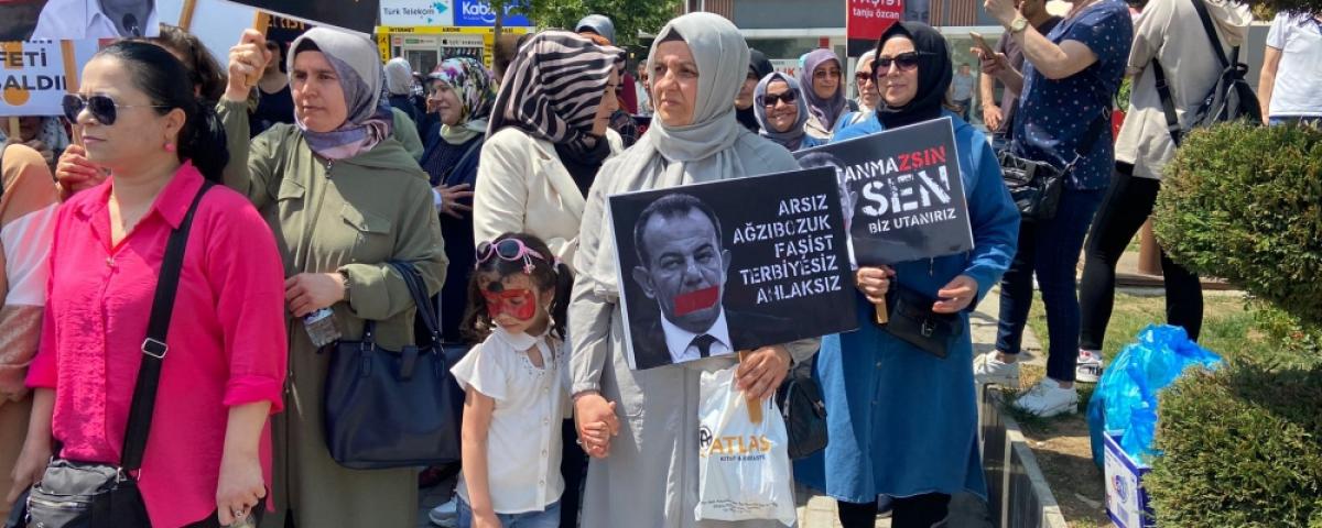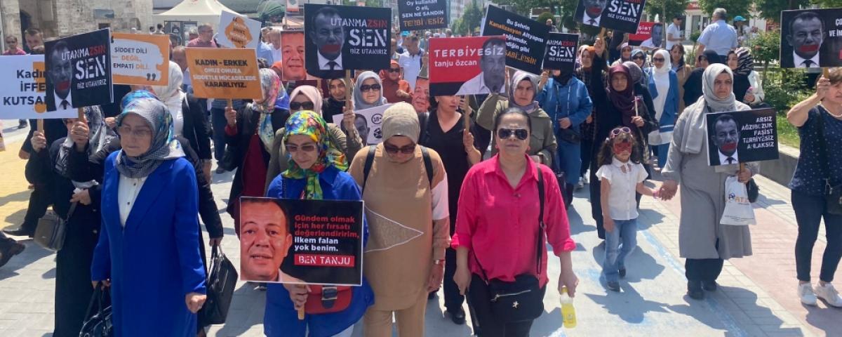 Ellerinde "Utanmazsın sen biz utanırız", "Kadının iffeti kutsaldır", "Terbiyesiz Tanju Özcan", "Kadına şiddet insanlığa ihanet", "İffetsizlikle iffet savunulmaz" gibi yazıların bulunduğu dövizler taşıyan kadınlar ile parti üyeleri, Bolu Belediyesi önünde basın açıklaması yaptı.