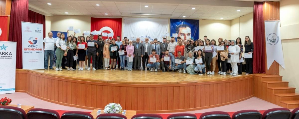 Sanayi ve Teknoloji Bakanlığı, Kalkınma Ajansları Genel Müdürlüğü 2022 ve 2023 yıllarını “Genç İstihdamı” teması olarak belirleyerek bu kapsamda “Genç İstihdamı” projesi hayata geçirmişti. Bu kapsamda Üniversitemiz ve Doğu Marmara Kalkınma Ajansı (MARKA) Bolu İl Koordinatörlüğü'nün iş birliğinde, eğitmen Fırat Polat tarafından BAİBÜ Bolu Meslek Yüksekokulu'nda 25-26 Mayıs 2022 tarihlerinde eğitimler gerçekleştirdi. Etkili iletişim, girişimcilik, iş görüşmesi ve mülakat teknikleri, yaratıcı düşünce gibi konu başlıklarında verilen eğitimleri başarıyla tamamlayan öğrencilerimize sertifikaları Bolu Meslek Yüksekokulu Konferans Salonu'nda düzenlenen törenle verildi.