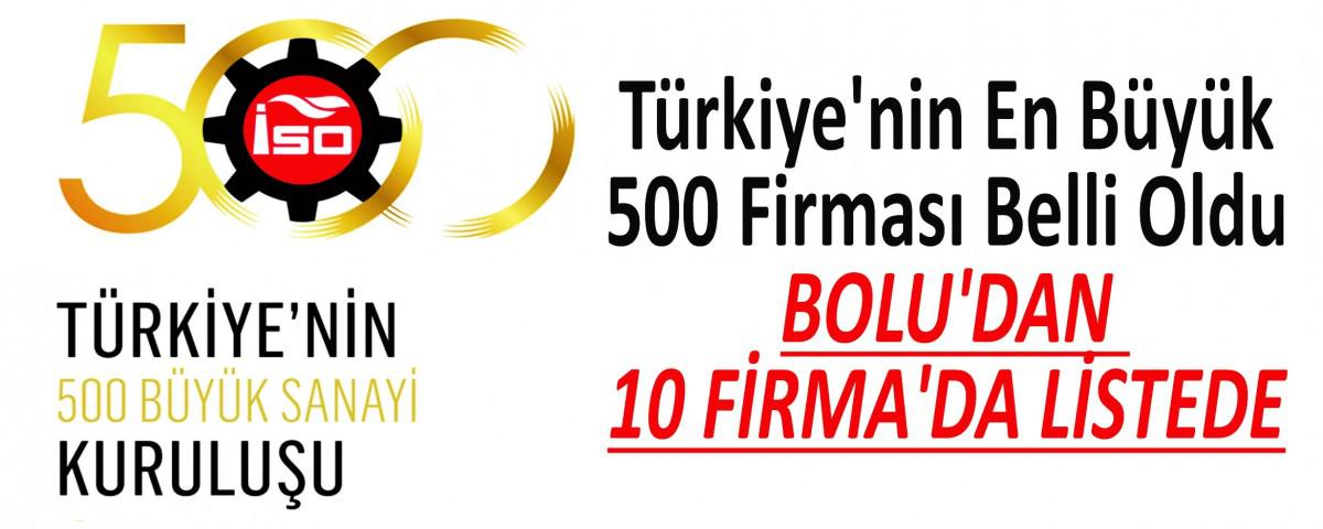 İstanbul Sanayi Odası tarafından açıklanan 2021 yılı Türkiye'nin 500 ve İkinci 500 Büyük Sanayi Kuruluşu araştırmasının sonuçları belli oldu. Bolu Ticaret ve Sanayi Odası Başkanı Türker Ateş, 2021 yılı İSO Birinci ve İkinci 500 Büyük Sanayi Kuruluşu listelerinde ilimizde faaliyet gösteren 10 firmanın yer aldığını, bu firmalardan 7 tanesinin birinci 500, 3 tanesinin ise ikinci 500 büyük sanayi kuruluşu içinde olduklarını ifade etti.